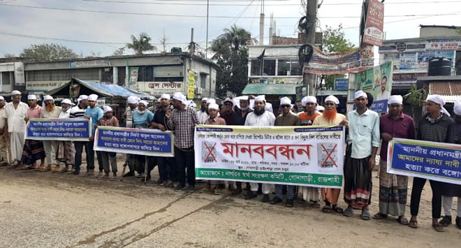 গোদাগাড়ী পৌরসদরের ডাইংপাড়া মোড়ে রাজশাহী-চাঁপাইনবাবগঞ্জ মহাসড়কে এ মানববন্ধন অনুষ্ঠিত হয়।