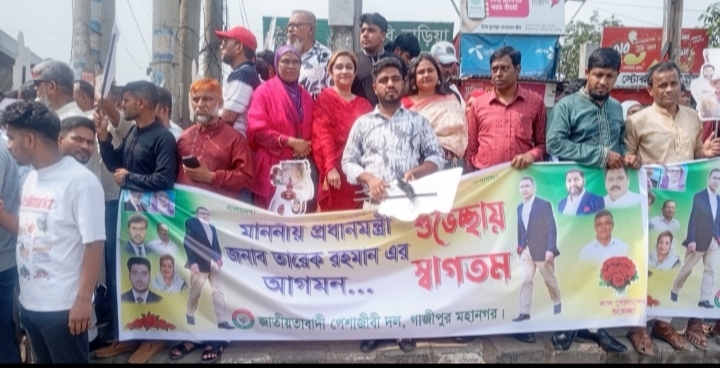 বগুড়ার উদ্দেশ্যে সড়কপথে যাত্রাপথে গাজীপুরে যাত্রাবিরতিকালে প্রধানমন্ত্রী জনাব তারেক রহমানকে উষ্ণ ও বর্ণাঢ্য সংবর্ধনা জানিয়েছেন স্থানীয় নেতাকর্মীরা। আজ সোমবার সকালে প্রধানমন্ত্রীর আগমনকে কেন্দ্র করে ঢাকা-ময়মনসিংহ মহাসড়কসহ গাজীপুরের বিভিন্ন এলাকা যেন এক উৎসবের নগরীতে পরিণত হয়। দলের প্রাণপ্রিয় নেতাকে এক নজর দেখার জন্য হাজার হাজার নেতাকর্মী রাজপথে ভিড় করেন।