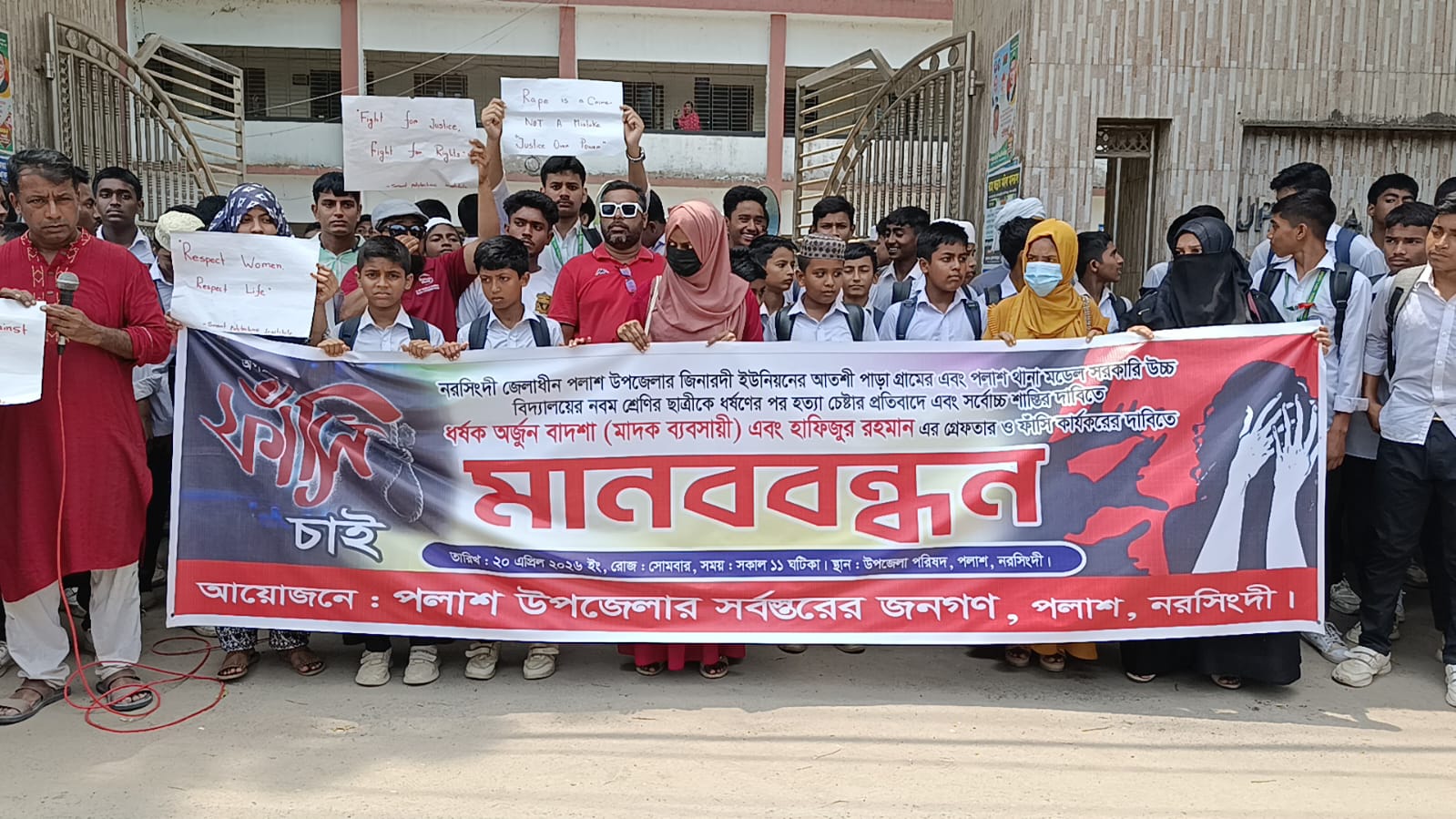 নরসিংদীর পলাশ উপজেলার জিনারদী ইউনিয়নের আতশীপাড়া গ্রামে নবম শ্রেণির এক ছাত্রীকে ধর্ষণ ও হত্যাচেষ্টার প্রতিবাদে এবং জড়িতদের দ্রুত গ্রেপ্তার ও সর্বোচ্চ শাস্তির দাবিতে মানববন্ধন অনুষ্ঠিত হয়েছে।